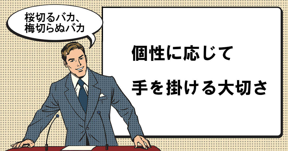 桜切るバカ、梅切らぬバカは、後輩や部下の個性にあわせた接し方や、指導の仕方をかえる必要性を説いてくれることわざです。