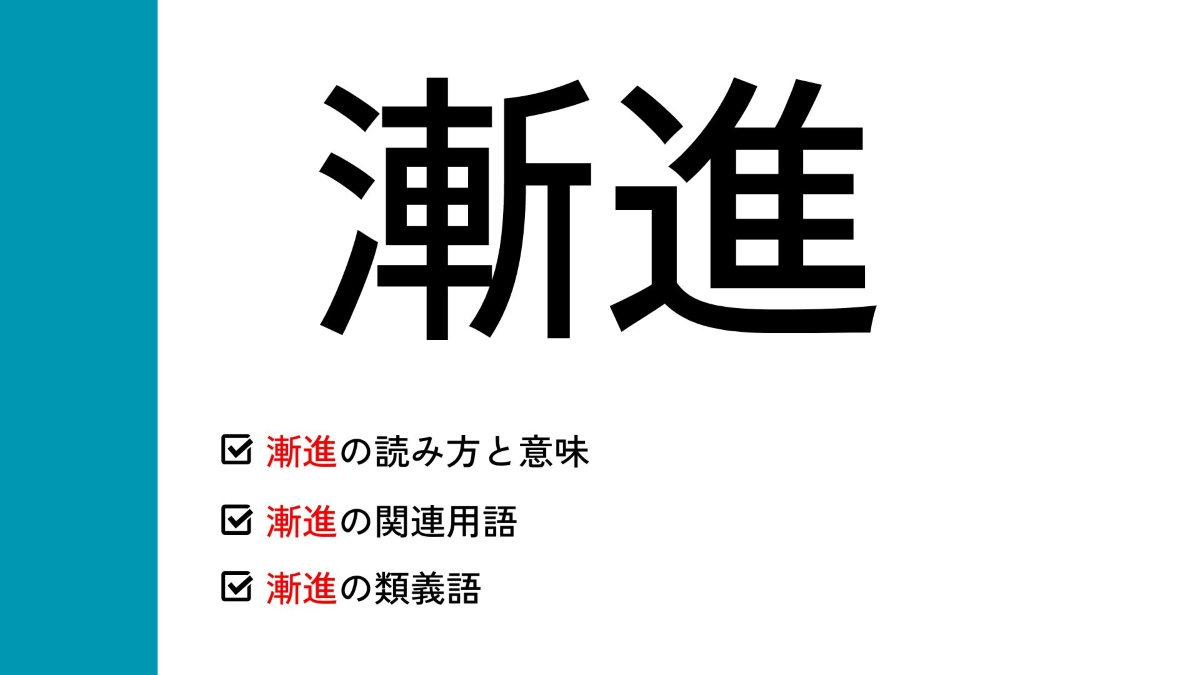 この記事では漸進の読み方と意味をはじめ、漸進や斬新との違いや、先述した「漸進性の原則」と「漸進主義」の意味、および漸進の類義語と対義語、英語表現について解説しています。